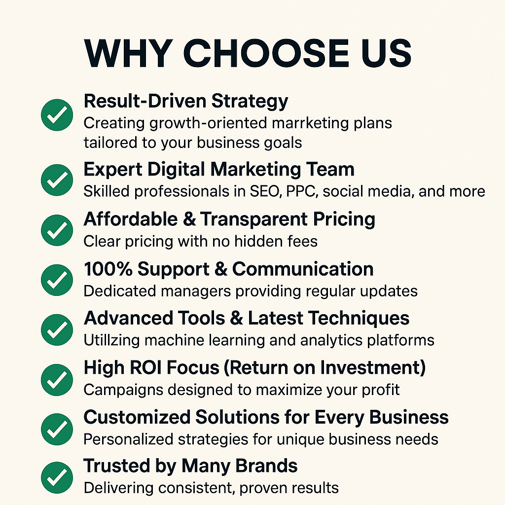 At Vicky Innovation, we provide customized and result-driven digital marketing solutions designed to match your business goals. Our experienced team uses a powerful combination of SEO, Social Media Marketing, Google Ads, Branding, and advanced analytics to deliver maximum ROI. With transparent pricing, AI-powered tools, consistent communication, and dedicated support, we help your business grow effectively in the digital space. Our focus is not just on driving traffic but on generating real leads, conversions, and long-term success — which is why brands trust us.